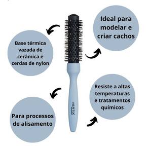 Escova de cabelo redonda com base térmica vazada de cerâmica e cerdas de nylon. Ideal para processos de alisamento como escovas progressivas, definitivas, ideal também para modelar e criar cachos em cabelos muito longos. Tamanho pequeno. Resiste a altas temperaturas e tratamentos químicos. Cabo antiderrapante.