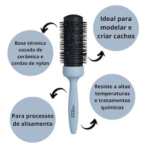 Escova de cabelo redonda com base térmica vazada de cerâmica e cerdas de nylon. Ideal para processos de alisamento como escovas progressivas, definitivas, ideal também para modelar e criar cachos em cabelos muito longos. Tamanho grande. Resiste a altas temperaturas e tratamentos químicos. Cabo antiderrapante.