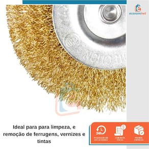 A Escova Circular é ideal para limpeza, e remoção de ferrugens, vernizes e tintas. Indicado para uso em esmerilhadeira, acompanha anel de redução de tamanho para adaptar em diversos tipos de máquinas. CARACTERÍSTICAS TÉCNICAS:Material: Aço latonado e aço carbonoMedidas: 100mm diâmetro x 10mm haste Velocidade máxima: 4500 RPMMarca: StarferRef.: 5037379