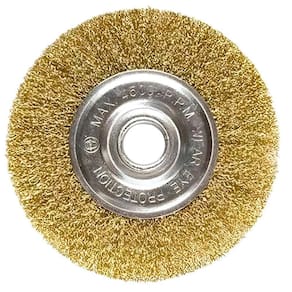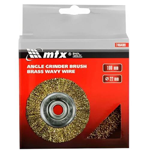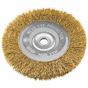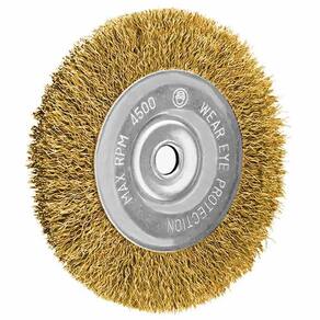 Escova Circular Ondulada de 100mm e furo de 22mm, em Aço carbono latonado e revestimento de latão, usada para limpeza leve de superfícies de sujeira, ferrugem, remoção de pintura.