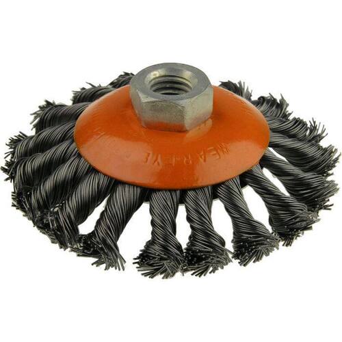 Escova Cônica Côncava Trançada 100XM14 para Esmilhadeira Starfer Escova Cônica Côncava Trançada com cerdas em aço latonado 100mm de diâmetro, 19mm de altura e com encaixe rosca M14. O aço latonado, material apresenta flexibilidade e oferece um diferencial de qualidade agregando fino acabamento em superfícies de alumínio; -para tratamento de superfícies metálicas, retirada de ferrugem, retirada de pintura entre outros. -para uso em esmerilhadeiras. -limite máximo 12500rpm. Embalagem: caixa avulsa. Ref.: 05037328 Marca: Starfer