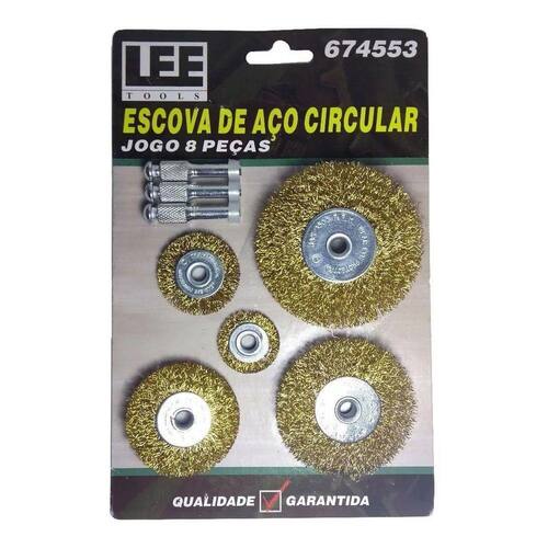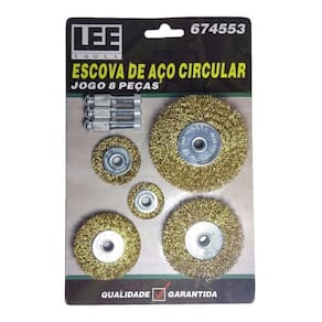 DESCRIÇÃO DO PRODUTOJogo de Escova de Aço Circular com 8 peças. Ideal para limpar superfícies em geral,principalmente aquelas com muita oxidação, asEscovas rotativas podem ser usadas com furadeiras em geral.Marca: LEE TOOLSCaracterísticasComposição: Aço latonado.Velocidade máxima: 4500 r.P.M.Conteúdo:1 Jogo de Escova de Aço Circular com 5 peças.1 Jogo com 3 hastes para foxação das escovas.Ideal para tirar ferrugem superficial, limpar, escovar, retirar incrustações de cola ou tinta, remoção de rebarba e desencrostar superfícies.Para uso profissional.REF.674553