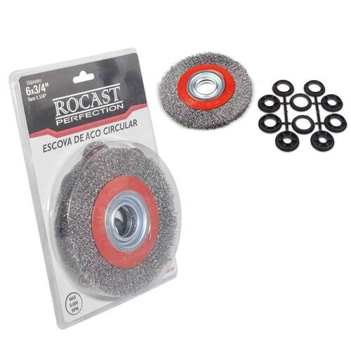 A escova de aço circular é a mais comum pros modelos elétricos. Ela existe em vários tamanhos, pra ser encaixada em furadeiras, esmerilhadeiras e lixadeiras, e serve tanto pra limpeza como pra remoção de ferrugens, vernizes e tintas.