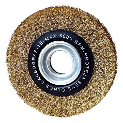- Especificações Técnicas: Diâmetro: 6" (150 mm) Espessura: 3/4" (19 mm) Rotação máxima: 6000 rpm Material das cerdas: Aço latonado