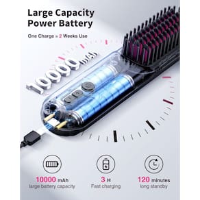 Escova alisadora de cabelo sem fio – pente de alisamento portátil para viagens – Aquecimento rápido dos anos 30, recarregável com USB-C duplo de 10.000 mAh, 300 milhões de íons negativos mais suaves, - Escova de alisamento sem fio atualizada: estilize a qualquer hora, em qualquer lugar, para uma beleza confiante durante todo o dia. A escova de alisamento Bopcal apresenta o mais recente design sem fio, liberando você do incômodo de procurar tomadas e lidar com fios emaranhados. Pesando apenas 300 g, esta escova alisadora leve e portátil é fácil de transportar, tornando-a sua companhia de estilo perfeita para o escritório, passeios, viagens e vida cotidiana. - Duas semanas de estilo com uma carga: o alisador de cabelo sem fio Bopcal possui uma bateria de 10.000 mAh, 200% maior do que outros modelos sem fio, com uma velocidade de carregamento 70% mais rápida. Aproveite até 120 minutos de uso com uma carga completa, aquecendo em apenas 30 segundos com carregamento rápido tipo C. Seu modo inovador de alimentação dupla permite que você o use enquanto estiver conectado quando a bateria estiver fraca, proporcionando uma experiência de estilo conveniente. - Suave e nutritivo, abrace o brilho elegante: o alisador de cabelo sem fio libera até 300 milhões de íons negativos, neutralizando a estática e domando o frizz. Seu revestimento protetor retém a umidade e reduz o atrito em 80%, permitindo que deslize sem esforço sobre o cabelo sem puxar, minimizando danos e melhorando o brilho. - 9 configurações de temperatura, sem limites para tipos de cabelo: a escova alisadora Bopcal Cordless oferece 6 opções de temperatura extras do que outras, expandindo a faixa de temperatura para atender às diversas necessidades de cabelos finos a grossos. Seja para crianças ou mães, todos podem encontrar a configuração de temperatura mais adequada. Ele também possui uma função de memória para estilo rápido e um visor LCD transparente para facilitar o uso. - Características de segurança: o chip de controle de temperatura inteligente evita o superaquecimento, enquanto um desligamento automático de 30 minutos garante tranquilidade. As cerdas antiqueimaduras elevadas fornecem proteção extra para o couro cabeludo, tornando-as adequadas para toda a família. A trava de segurança do modo de voo melhora a portabilidade - Uma ideia de presente cuidadosamente escolhida: o alisador de cabelo sem fio Bocpal vem com uma bolsa de armazenamento para facilitar a organização e portabilidade, o que o torna a escolha ideal para filhas, mães, amigas e esposas. Seja para o Dia das Mães, Dia dos Namorados ou aniversário, este presente transmite sentimentos calorosos, permitindo que ela tenha cabelos elegantes e brilhantes a qualquer hora, em qualquer lugar. (O produto não vem com um adaptador, que precisa ser comprado separadamente)