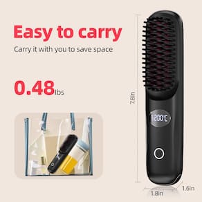 Experimente o estilo em movimento com esta escova de alisamento de cabelo sem fio. Projetada para conveniência em viagens, esta escova de alisamento de cabelo leve e portátil dá a você um cabelo suave e sem frizz em movimento. Ele usa tecnologia iônica avançada para alisar suavemente e alisar o cabelo enquanto minimiza os danos causados pelo calor. Aquecimento rápido e uma faixa de temperatura ajustável (160°C a 200°C ou 160.0 °C a 204.4 °C) garantem um estilo ideal para todos os tipos de cabelo. Equipado com uma bateria de longa duração e carregamento tipo C, pode ser utilizado durante o carregamento, tornando-o um companheiro versátil para suas necessidades de estilo. O visor digital LED oferece controle preciso de temperatura e o design ergonômico garante uma aderência confortável durante o uso. Pesando apenas 218 gramas, esta escova de alisamento de cabelo sem fio é a companhia perfeita de viagem, facilitando a criação de penteados de salão onde quer que suas aventuras o levem.