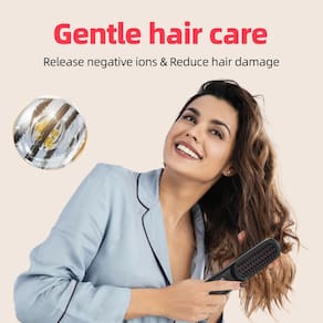 - ?Menos fricção e menos danos?Os dentes do pente são feitos de tecnologia de aquecimento de cerâmica MCH. Placa de cerâmica de aquecimento embutida, temperatura constante automática, reduz danos ao cabelo. A camada externa tem um revestimento de queratina capilar para evitar que o cabelo fique emaranhado e diga adeus ao frizz e ao ressecamento.