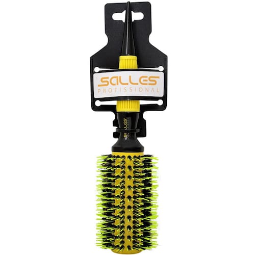 Escova profissional térmica, com base revestida em cerâmica amarela - salles profissional tamanho: 34mm nº04 cerdas mistas dupla altura, de javali e nylon em 'v', que proporciona maior tração na escovação. Ideal para cabelos mais crespos. Cabo em madeira laqueada preta, pontiagudo e anatômico, revestido em borracha, é ideal para alisar e modelar qualquer tamanho e tipo de cabelo. Especificações: a cerâmica ajuda a manter o calor do secador e agiliza a secagem. Para manter a durabilidade da escova, mantenha uma distância mínima de 5 cm do secador durante o uso. Material: cerâmica, madeira, cerdas de javali, nylon e borracha. Cor predominante: preto com amarelo.