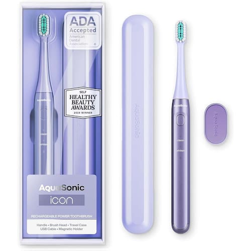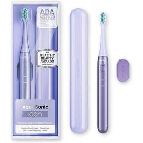 Aprovada pela ADA: a escova de dentes elétrica recarregável AquaSonic Icon ganhou o prestigioso selo de aprovação da American Dental Academy. Aumente sua escovação: use a mesma técnica de escovação que uma escova de dentes manual, enquanto a Icon produz microvibrações para melhorar o efeito de limpeza. Tecnologia moderna: o ícone possui 2 modos de escovação e um temporizador inteligente integrado que sinaliza a cada 30 segundos e desliga após 2 minutos. Sua bateria de íons de lítio mantém uma carga por mais de 30 dias de escovação. Armazenamento elegante: vem com um suporte magnético e um estojo de viagem ultrafino para manter o ícone limpo e facilmente acessível quando não estiver em uso. Inclui: alça de escova de dentes, cabeça de escova, suporte magnético, estojo de viagem, cabo de carregamento. - Aprovada pela ADA: a escova de dentes elétrica recarregável AquaSonic Icon ganhou o prestigioso selo de aprovação da American Dental Academy. - Aumente sua escovação: use a mesma técnica de escovação que uma escova de dentes manual, enquanto a Icon produz microvibrações para melhorar o efeito de limpeza. - Tecnologia moderna: o ícone possui 2 modos de escovação e um temporizador inteligente integrado que sinaliza a cada 30 segundos e desliga após 2 minutos. Sua bateria de íons de lítio mantém uma carga por mais de 30 dias de escovação. - Armazenamento elegante: vem com um suporte magnético e um estojo de viagem ultrafino para manter o ícone limpo e facilmente acessível quando não estiver em uso. - Inclui: alça de escova de dentes, cabeça de escova, suporte magnético, estojo de viagem, cabo de carregamento.