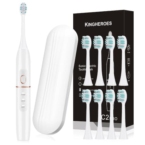 Kingheroes Escova de dentes elétrica para adultos, escova de dentes sônica recarregável com 4 modos, motor 42000 VPM, uma carga por 60 dias, vem com 8 cabeças de escova e estojo de viagem (branca) A escova de dentes eletrônica kingheroes adota a mais recente tecnologia de vibração sônica. O eixo de metal gera a força de vibração. A frequência de vibração pode alcançar até 42.000 vezes por minuto. Pode efetivamente remover a placa, branquear os dentes e melhorar a saúde bucal. A vibração que produz é como o som de um carro esportivo em vez do som semelhante ao trator do eixo de plástico normal. Faça login na sua conta da Amazon, escolha "Seus pedidos", encontre a ID do pedido, clique em "Entrar em contato com o vendedor". A kingheroes oferece suporte pós-venda sete dias por semana, vinte e quatro horas por dia. Os quatro modos oferecidos são limpos, brancos, macios e super. Você pode selecionar vários modos com base em suas preferências. As forças e modos de vibração em cada modo variam. Cada luz indica um determinado modo, e o super modo é indicado quando as luzes para os modos de limpeza, branqueamento e suavização continuam piscando. Tem um período de operação de 60 dias após ser totalmente carregado. Você não precisa carregar com frequência porque o carregamento rápido é suportado. Além disso, o kit inclui um estojo de viagem. É bastante conveniente que você possa levá-lo com você quando viajar. Como o conjunto vem com 8 cabeças de escova, você não precisará comprar a cabeça com muita frequência. Lembre-se de verificar a bolsa hermética da cabeça da escova antes de usá-la para ver se está aberta. Para evitar a revenda, cada uma das nossas cabeças de escova é embalada individualmente. As cerdas, no entanto, podem distorcer durante o transporte. Ele recuperará sua forma anterior em 15 segundos em água morna acima de 50 graus, então não há necessidade de se preocupar. Conteúdo da embalagem: 1 escova de dentes sônica kingheroes C2PRO, 1 cabo de carregamento USB-DC, 8 cabeças de escova, 1 estojo de viagem - A escova de dentes elétrica Kingeroes C2PRO adota a mais recente tecnologia de vibração sônica. O eixo de metal gera a força de vibração. A frequência de vibração pode alcançar até 42.000 vezes por minuto. Pode efetivamente remover a placa, branquear os dentes e melhorar a saúde bucal. Produz vibrações como o som de um carro esportivo, em vez do som de um trator de um eixo de plástico normal. - [4 modos] Os 4 modos oferecidos são limpos, brancos, macios e super. Você pode selecionar vários modos com base em suas preferências. As forças e modos de vibração em cada modo variam. Cada luz indica um determinado modo, e o super modo é indicado quando as luzes para os modos de limpeza, branqueamento e suavização continuam piscando. - [Tempo de espera ultralongo] Tem um período de operação de 60 dias após ser totalmente carregado. Você não precisa carregar com frequência porque o carregamento rápido é suportado. Além disso, o kit inclui um estojo de viagem. É bastante conveniente que você possa levá-lo com você quando viajar. - [Substituição da cabeça da escova] Como o conjunto vem com 8 cabeças de escova, você não precisará comprar a cabeça com muita frequência. Lembre-se de verificar a bolsa hermética da cabeça da escova antes de usá-la para ver se está aberta. Para evitar a revenda, cada uma das nossas cabeças de escova é embalada individualmente. As cerdas, no entanto, podem distorcer durante o transporte. Ele recuperará sua forma anterior em 15 segundos em água morna acima de 50 graus, então não há necessidade de se preocupar. - [Atendimento ao cliente] Faça login na sua conta da Amazon, escolha "Seus pedidos", encontre a ID do pedido, clique em "Entrar em contato com o vendedor". A kingheroes oferece suporte pós-venda sete dias por semana, vinte e quatro horas por dia. A Kingshoes fornecerá um serviço de garantia de um ano.