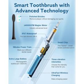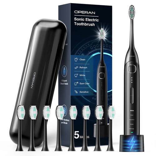 Características inteligentes: o temporizador inteligente de 2 minutos controlará o tempo de escovação da sessão e o temporizador de 30 segundos lembrará você de escovar um quadrante diferente da boca para ajudá-lo a praticar melhores hábitos de escovação. - 5 modos de escovação e 3 níveis de intensidade: modo branco: branqueia os dentes; modo de limpeza: limpeza diária; modo sensível: limpeza de baixa intensidade para gengivas ou dentes sensíveis ou para usuários iniciantes; modo de polimento: suaviza e ilumina os dentes; modo de massagem: massageia e melhora a saúde das gengivas. Cada modo vem com 3 níveis de intensidade para que você possa personalizar sua rotina de acordo com suas necessidades. - Características inteligentes: o temporizador inteligente de 2 minutos controlará o tempo de escovação da sessão e o temporizador de 30 segundos lembrará você de escovar um quadrante diferente da boca para ajudá-lo a praticar melhores hábitos de escovação. - Escova de dentes elétrica inteligente de 40.000 VPM: Escova de dentes sônica de alta vibração de até 40.000 VPM. Remova até 99,99% da placa e manchas para uma limpeza profunda ao longo da linha da gengiva e entre os dentes. - Vida útil da bateria de 100 dias e à prova d'água IPX7: uma carga completa leva 6 horas e oferece um mínimo de 100 dias de uso (2 usos por dia). A escova de dentes pode ser usada na banheira ou chuveiro, mas certifique-se de secá-la antes de tentar carregá-la. - O que vem na caixa: 1 escova de dentes elétrica Operan Sonic, 8 cabeças de escova Dupont (substitua a cada 2-3 meses), 1 cabo USB, 1 estojo de viagem? 1 base de carregador sem fio USB (observação: a base de carregamento não é à prova d'água), 1 manual de instruções (sem garantia de versão em português). Adaptador de parede não incluído.