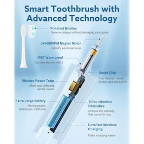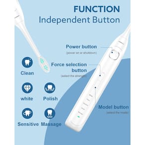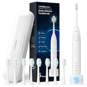 5 modos de escovação e 3 níveis de intensidade: modo branco: branqueia os dentes; modo de limpeza: limpeza diária; modo sensível: limpeza de baixa intensidade para gengivas ou dentes sensíveis ou para usuários iniciantes; Modo de polimento: suaviza e ilumina os dentes; Modo de massagem: massageia e melhora a saúde das gengivas. Cada modo vem com 3 níveis de intensidade para que você possa personalizar sua rotina de acordo com suas necessidades. Nota: Evite o contato direto com pasta de dente que contenham óleos essenciais ou óleo de coco. Isso pode resultar em desalojamento de tufos de cerdas e danos à cabeça da sua escova. - 5 modos de escovação e 3 níveis de intensidade: modo branco: branqueia os dentes; modo de limpeza: limpeza diária; modo sensível: limpeza de baixa intensidade para gengivas ou dentes sensíveis ou para usuários iniciantes; Modo de polimento: suaviza e ilumina os dentes; Modo de massagem: massageia e melhora a saúde das gengivas. Cada modo vem com 3 níveis de intensidade para que você possa personalizar sua rotina de acordo com suas necessidades. - Características inteligentes: o temporizador inteligente de 2 minutos controlará o tempo de escovação da sessão e o temporizador de 30 segundos lembrará você de escovar um quadrante diferente da boca para ajudá-lo a praticar melhores hábitos de escovação. - Escova de dentes elétrica inteligente de 40.000 VPM: escova de dentes sônica de alta vibração de até 40.000 VPM Remova até 99,99% da placa e manchas para uma limpeza profunda ao longo da linha da gengiva e entre os dentes. - Vida útil da bateria de 100 dias e IPX7 à prova d'água: uma carga completa leva 6 horas e oferece um mínimo de 100 dias de uso (2 usos por dia). A escova de dentes pode ser usada na banheira ou no chuveiro, mas certifique-se de secá-la antes de tentar carregá-la. - O que vem na caixa: 1 escova de dentes elétrica sônica OPERAN, 8 cabeças de escova dupont (substitua a cada 2-3 meses), 1 cabo USB, 1 estojo de viagem, 1 base de carregador USB sem fio (Nota: a base de carregamento não é à prova d'água), 1 manual de instruções. Adaptador de parede não incluído.