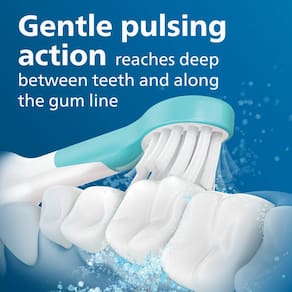 - A ação pulsante suave alcança profundamente entre os dentes e ao longo da linha da gengiva, para que as crianças tenham a melhor limpeza possível enquanto ainda aprendem a escovar.