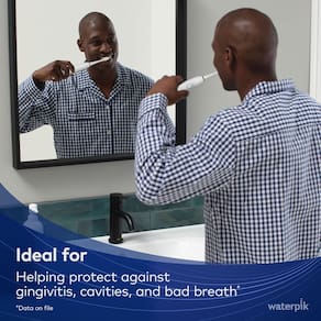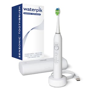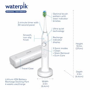 Escova de dentes elétrica Waterpik Sensonic Sonic, escova de dentes recarregável para adultos com 3 modos, estojo de viagem, carregador USB, branca STW-03W020 - 3 MODOS DE ESCOVAÇÃO: A escova de dentes elétrica Waterpik Sensonic possui 3 modos para personalizar a escovação com o toque de um botão: limpar - para o desempenho diário; remover manchas - para remover manchas superficiais; e cuidado com as gengivas - para melhorar suavemente a aparência estimulação do esperma. - REMOÇÃO EFICAZ DA PLACA: comprovado clinicamente que remove até 4 vezes mais bactérias da placa bacteriana do que a escovação manual em áreas de difícil acesso e ajuda a proteger contra gengivite, cáries e mau hálito. Aceito pela American Dental Association. - MELHOR CABEÇA DE ESCOVA: limpa áreas de difícil acesso, até mesmo dentes posteriores, com um padrão de cerdas especialmente projetado que abraça as superfícies dos dentes para proporcionar uma limpeza mais profunda. Para que você saiba quando substituir, as cerdas verdes de lembrete desbotam para amarelas. - CARACTERÍSTICAS PRINCIPAIS: A bateria recarregável de íon de lítio dura até 4 semanas por carga, temporizador de 2 minutos com marcapasso de 30 segundos, indicador de recarga, 3 modos, cerdas macias compatíveis com ADA, tecnologia ultrassilenciosa, alça ergonômica com acabamento antiderrapante. - INCLUÍDO: escova de dentes elétrica Waterpik Sensonic, 1 cabeça de escova Waterpik Sensonic Contour, estojo de viagem premium, cabo USB-C para USB-A (requer adaptador de parede USB-A, não incluído), base de carregamento, garantia limitada do fabricante de 2 anos, consulte o manual para obter detalhes. - CABEÇAS DE ESCOVA DE SUBSTITUIÇÃO: Use cabeças de escova Waterpik Sensonic Contour genuínas, modelo STWB-3WW-B
