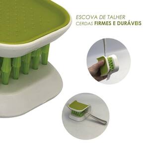 -cerdas firmes e duráveis: as cerdas da escova são firmes e resistentes, proporcionando uma limpeza eficaz e duradoura. -limpeza fácil e eficiente: remova facilmente resíduos de alimentos e sujeiras incrustadas dos seus talheres de maneira rápida e eficiente. -conforto e ergonomia: a escova se encaixa perfeitamente em sua mão, oferecendo uma experiência de limpeza confortável e eficiente. -compacta e fácil de armazenar: além de ser altamente funcional, a escova de talher é compacta e fácil de armazenar. Mantenha-a na gaveta da cozinha ou pendure-a próximo à pia, sempre à mão quando precisar.