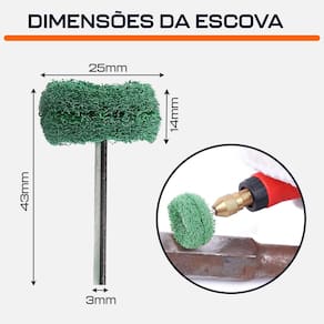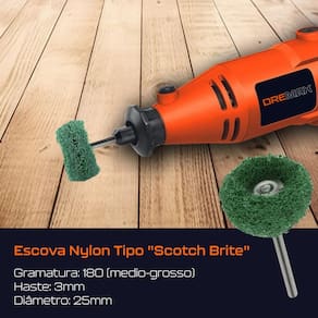 Escova de Polimento Nylon 25mm Grão 180 para Micro Retíficas Dremax - Marca: Dremax - Referência: EPN002 - Cor: Verde - Material: Fibra do nylon - Gramatura: Grão 180 grosso-médio - Diâmetro da escova: 25mm 1 Pol. - Espessura aproximada da escova: 14mm - Diâmetro da haste: 3mm 1/8 Pol. - Comprimento: 43mm - Modelo exclusivo com 3 camadas de espessura, mas eficaz e durável que os concorrentes - Escova tipo Scotch Brite - Velocidade de trabalho recomendada: 2.000 a 12.000rpm - As escovas almofadas de polimento são usadas em polimento madeira, metal, polimento de pedra etc. , gravura, moagem, lixamento e limpeza - Ideal para limpeza, desbaste e polimento de todos os tipos de joias e metais preciosos. - Acessório indicado para joalheiros, serralheiros, armeiros, técnicos, colecionadores de moedas, arqueólogos, estudantes, etc. - Indicado para todas as marcas de micro retíficas, como Dremel, Charbs, Einhell, Black+Decker, Dremax, Mondial, Vonder, Titanium, Western, Ingco, Gamma, Wesco, etc. - : 90 dias contra defeitos de fabricação A DREMAX é a primeira e única marca brasileira dedicada exclusivamente às micro retíficas, acessórios e acoplamentos para esta indispensável ferramenta. Seja para trabalhos de precisão, artesanato, modelagem ou reparos, a DREMAX tem o produto certo para você.