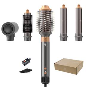 Escova para secador de cabelo 5 em 1. Especificações Cor do anfitrião: cinza e dourado Potência nominal: 1000 W Tensão nominal: 100-120 V Frequência nominal: 50/60 Hz Controle de calor do vento: sistema de controle independente Incluído na embalagem: Tubo principal. Cabeça de secador de cabelo. Modelador de cabelo de 32 mm. Escova volumizadora oval de 60 mm. Escova redonda de 32 mm. 1 caixa de armazenamento. Manual do usuário - Modelador de cabelo multi 5 em 1: equipado com um secador de cabelo potente, secagem ultrarrápida em 10 minutos; varinha modelador de ar de 32 mm, enrolar em diferentes direções, usando a tecnologia Coanda; escova volumizadora oval de 60 mm para volume e alisamento de cabelos longos ou curtos; a escova redonda de 32 mm cria um cacho fofo natural que é mais adequado para franja - Secador de cabelo de alta velocidade de 110.000 RPM: motor sem escova de alta velocidade de 110.000 RPM e alto desempenho de 1000 W criam um forte movimento de ar, o que permite que o secador seque ultrarrápido enquanto mantém o calor baixo, mantendo seu cabelo liso e brilhante - Sistema de ondulação de ar: inclui varinha de ondulação de cabelo de 3 cm nas direções esquerda e direita, usando a tecnologia Coanda, o poderoso movimento contínuo de ar garante que os cachos cheguem à superfície do modelador, criando volume mais rápido e ondulado natural sem aquecimento extremo - Cuidado iônico sem danos ao calor: o secador de cabelo libera milhares de íons negativos para cuidar do seu cabelo durante a secagem; conjunto com 3 modos de temperatura (frio-quente-quente) e 2 ajustes de velocidade do vento, para atender às necessidades de vários tipos e efeitos de cabelo, obtenha cuidados com o cabelo de salão de luxo sem danos causados pelo calor - Use com confiança: fácil de operar, equipado com um design de carroceria de alta qualidade e atende aos requisitos de segurança dos EUA. O plugue de segurança ALCI detecta qualquer desequilíbrio de corrente e desliga para evitar eletrocussão - Potência nominal: 1000 W; Tensão nominal: 100-120 V; Sem tensão dupla, apenas para EUA e CA