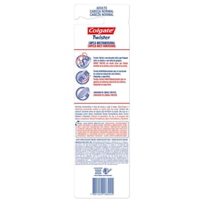 Escova dental Colgate Twister para uma limpeza multidimensional com cerdas twister que limpam entre os dentes e em volta da gengiva. Possui cabo antiderrapante e cerdas em formato "V" que tem profundo alcance para uma melhor limpeza entre os dentes Limpador de língua que ajuda a remover as bactérias causadoras do mau hálito Limpeza multidimensional Cores sortidas