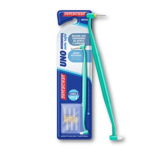 Escova Dental Dentalclean: Uno + Refil Inter 0.5 Cilindrica Com cabeça de tufo único em uma extremidade, a escovaUNO + Interdental com refilapresenta filamentos macios, para uma limpeza eficaz em toda a superfície do dente e do contorno da gengiva junto ao sulco gengival. Na outra extremidade, possui a interdental com refil, para limpeza de lugares de difícil acesso, entre os dentes e/ou . Os formatos são Cônica e Cilíndrica, com arame revestido de 0,5mm. Texturas disponíveis: Macia Cores disponíveis: Verde Marca: Não Informado Ean: 7898185412663