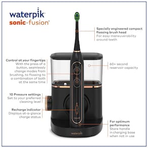 Cor Preto. A escova de dentes do fio dental Waterpik Sonic Fusion SF 02 combina o poder de uma escova de dentes elétrica Sonic recarregável avançada com a eficácia comprovada do Waterpik Water Flosser. UM DISPOSITIVO FAZ TUDO A tecnologia do fio dental está integrada na cabeça da escova para fornecer uma limpeza completa. Com o apertar de um botão, o Waterpik Sonic Fusion muda perfeitamente da escovação para o fio dental para ambos e remove as bactérias nocivas e detritos entre os dentes e abaixo da linha da gengiva que a escovação tradicional e o fio dental não podem alcançar. CARACTERÍSTICAS E NA CAIXA 2 cabeças de escova de fio dental com código de cores Cabeça de escova projetada para alcançar os dentes traseiros no ângulo correto para o fio dental com água Cronômetro de escovagem de 2 minutos com marcapasso de 30 segundos Controle avançado de pressão de água com 10 configurações Escova de dentes recarregável e base de carregamento recarregável Escova de dentes luz indicadora Estojo de escova de dentes Deluxe para viagem O reservatório retém 414ml de água por 60 segundos de tempo de uso do fio dental Pode ser com seu enxaguatório bucal favorito Marca: Não Informado