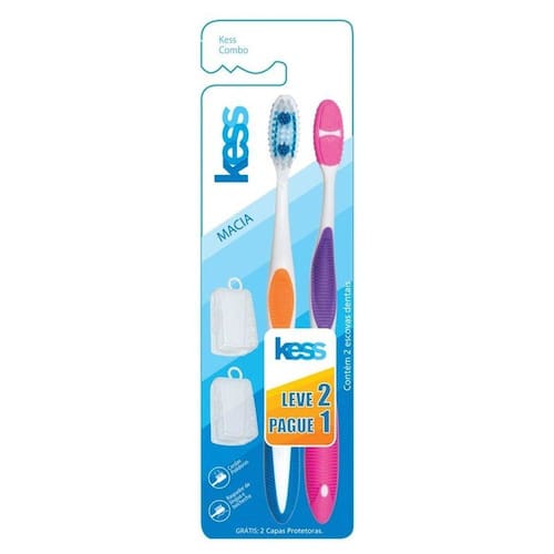 Sua embalagem Leve 2 Pague 1 trás economia aliado a qualidade das escovas dentais Kess, que possui cerdas macias e alongadas nas extremidades, raspador de língua e bochechas e cabo antiaderente.