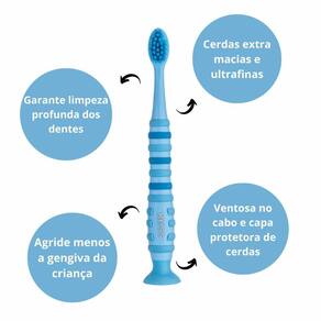 Maior número de cerdas* que garantem limpeza profunda dos dentes. Cerdas extra macias e ultrafinas feitas de um material especial que oferecem mais conforto na escovação, agredindo menos a gengiva da criança e oferecendo maior conforto na escovação. Cabeça compacta que ajuda a alcançar os dentes posteriores. Ventosa no cabo. Capa protetora de cerdas.