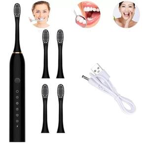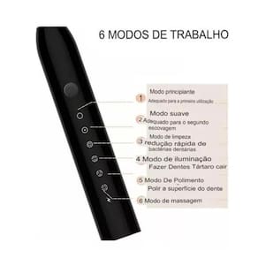 Material: ABS; Cerdas de nylon DuPont Bateria embutida: de lítio 500mAh mAh Tensão de carregamento: 5V Nível à prova d'água: IPX7 Tamanho: aprox. 220 x 25 mm Fonte de alimentação: carregamento USB Potência de motor: 1,5 W Tensão nominal: DC 3,7V Duração de bateria: 45 a 60 dias com 5 horas de carregamento 4 cabeças de substituição Velocidade: 42.000 rpm 6 Modos de Frequência Temporização científica de 2 minutos, Memória para mudança de intervalos de 30 segundos