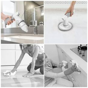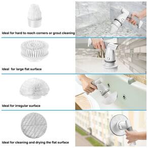 SEM FIO E LEVE O mais recente design sem fio do Spin Scrubber elétrico em 2021 elimina os problemas cas pelo emaranhamento de linhas de energia tradicionais, ele pode ser em qualquer lugar que você quiser. Esta lavadora é super leve e muito fácil de pegar e usar para limpar superfícies sem se cansar. TUDO EM UMA ÚNICA ROTAÇÃO 4 CABEÇAS DE ESCOVA A lavadora elétrica de rotação inclui 4 cabeças de escova para atender às suas diferentes necessidades de limpeza. A escova de cúpula é perfeita para banheira ou pia. A escova plana é adequada para piso, azulejo, forno e fogão. A escova de canto pontiaguda é ótima para limpar o peitoril da janela, cantos e lugares apertados, até rodas de bicicleta. A escova de pano é ideal para limpeza e secagem de superfícies planas. EFICIENTE E PODEROSO Você está se sentindo cansado, demorado e trabalhoso depois de fazer trabalhos de limpeza Nosso Power Scrubber está aqui para ajudá lo, o que pode tornar suas tarefas de limpeza eficientes e fáceis. Este poderoso purificador pode economizar metade do tempo de limpeza e facilmente se livrar de escória, sujeira, para cuidar de seus joelhos e costas. Um bom purificador de banheiro para limpar pia de cozinha, fogão a gás e chuveiro. LIMPEZA MAIS FÁCIL E ECONOMIA DE TEMPO A alça ergonomicamente projetada, limpa sem esforço, relaxa os joelhos e as costas. Lavadora giratória manual de alto torque com potência de até 280 r, min, a lavadora elétrica produz uma força poderosa para ajudar a limpar manchas e manchas sujas. Poupança de trabalho e cuidados com as articulações