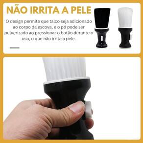Essa escova espanador de limpeza profissional para barbeiros e cabelereiros, foi projetada para facilitar a limpeza de fios após cortar, aparar ou barbear. Ao limpar o pescoço e as orelhas, suas cerdas densas de fibras macias proporcionam uma sensação de conforto sem irritar a pele, garantindo uma boa experiência durante o uso. Seu design prático permite que talco seja adicionado ao corpo da escova, e para o talco ser liberado basta apenas apertar o botão durante o uso. Sua alça com pequenas ranhuras antiderrapantes na extremidade é confortável de segurar e evita o deslizamento durante o uso. Item ideal para quem busca garantir uma experiência confortável para seus clientes sem perder a praticidade