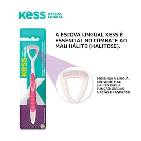 A Escova Lingual Kess é essencial no combate ao mau hálito. Possui cerdas macias e raspadoras que higieniza com eficácia a língua evitando o mau hálito. A Escova Lingual Kess garante principalmente a remoção da saburra lingual, formada sobretudo por bactérias e restos de alimentos que se acumulam e deixam a língua com aspecto esbranquiçado.