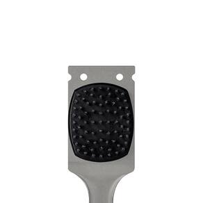 A escova possui estrutura, cerdas e raspador em aço inoxidável, garantindo resistência e durabilidade. O cabo é feito de polipropileno preto, proporcionando conforto e segurança durante o uso.