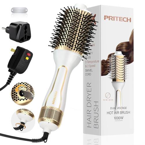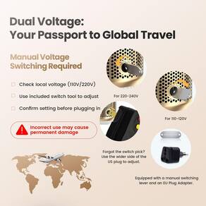 Especificação: Tipo de motor: DC Tensão nominal do motor: 110V/220V Potência nominal: 1000W Comprimento do cabo: 1,8 m Cor: Platina Plugue de segurança: UL aprovado US ALCI Plugue de segurança - Pronto para o mundo todo e seguro: o design de voltagem dupla (110 V/220 V) funciona globalmente com a nova versão incluída do adaptador de plugue da UE. O plugue de segurança ALCI integrado evita riscos elétricos, estabilizando a corrente e desligando automaticamente durante surtos. Para garantir uma viagem perfeita, recomendamos carregar um adaptador de viagem padrão extra compatível com o Euro. - Estilo de qualidade de sal em minutos: Seque, estilize e adicione volume em um passo! Barril de titânio de cerâmica + tecnologia iônica distribui uniformemente o calor para cabelos lisos e brilhantes com 65% menos frizz. Perfeito para explosões, cachos ou visuais elegantes — sem necessidade de marcação no salão. - AJUSTE DE TENSÃO MANUAL PARA SEGURANÇA: Sempre use a palheta de interruptor incluída para definir manualmente a tensão (110V/220V) antes de usar. Verifique as configurações para combinar com as tomadas locais — garante a segurança do dispositivo e o desempenho ideal. - Calor personalizado para cabelos saudáveis: proteja seu cabelo com 3 configurações de calor ajustáveis (ar frio, ar quente suave, ar quente forte). O motor de 1000 W seca rapidamente enquanto minimiza danos — ideal para cabelos finos ou médios. Peso portátil com menos de 1 lb˜ uma caixa de leite de 450 ml, o cabo giratório ergonômico de 2 m de 360° evita emaranhados para um estilo sem desconforto. - Garantia de 1 ano e suporte sem complicações: sua confiança é importante! Desfrute de uma substituição de 1 ano se surgir algum problema. com nosso atendimento ao cliente 24 horas por dia, 7 dias por semana, para obter soluções rápidas. Faremos o nosso melhor para fornecer uma solução satisfatória.