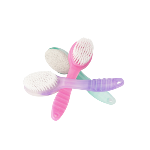 Lixa de pedicure com cabo anatômico fabricado em resina plástica. Possui de um lado uma escova para limpeza dos pés e do outro pedra pome para esfoliação da pele.