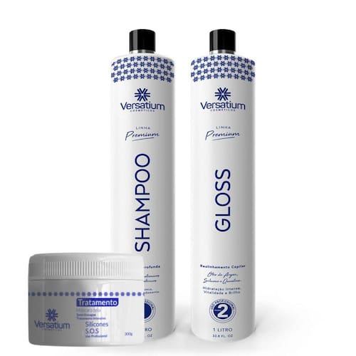 Registro Anvisa Not.:25351.719151/2020-38Sem formol de base orgânica, os principais componentes são silicones hidratantes, óleos graxos, silicone poliquaterno, óleo de argan, essência neutra e base neutra.A progressiva Versatium por ser sem formol de base orgânica pode ser feito em gestantes, lactantes, crianças e pessoas alérgicas pois ela é sem cheiro sem ardência e sem fumaça.Por ser de base orgânica sem formol a progressiva Versatium é compatível com todas as progressivas sem formol ou com formol.A progressiva Versatium por conter na sua formulação um pigmento violet43 uma matéria prima inteligente e moderna que mantem o tom do cabelo não deixando manchar ou desbotar excessivamente, e em cabelos com mechas e luzes não amarela, matiza.Em creme, por conta do pigmento Violet43 a cor é violeta Roxinho A progressiva Versatium é compatível com amônia ou relaxamento, Mas como essas duas químicas são muito agressiva ao cabelo recomendamos o uso da progressiva Versatium após 30 dias o uso da amônia ou relaxamento.Não fica pesado pois tem silicones emolientes que deixa o cabelo fácil de secar e pranchar, a progressiva Versatium tem um diferencial pois não precisa escovar.Você seguindo o passo a passo direitinho e usando uma prancha boa pranchando bem garantimos 100% de resultado. Por ter na sua formulação uma alta concentração de silicones hidratantes e óleos reconstrutores a progressiva Versatium é ideal para cabelos finos e frágeis. Kit vem com 3 produtos, 1 Gloss 1 litro, 1 Shampoo 1 litro e uma Mascara de tratamento 300gAltura Gloss 1 litro - 30cmLargura Gloss 1 litro - 7cmComp. Glos 1 litro - 7cmCor do produto - RoxaAltura Shampoo 1 litro - 30cmLargura Shampoo 1 litro - 7cmComp. Shampoo 1 litro - 7cmCor do produto - Incolor Altura mascara de tratamento 300g - 5cmLargura mascara de tratamento 300g - 9cmComp. Mascara de tratamento 300g - 9cmCor do produto - Branca Marca: Versatium
