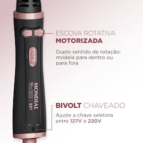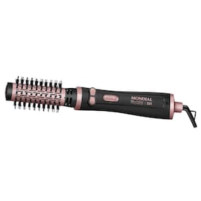 ESCOVA ROTATIVA MOTORIZADA: A escova Mondial une o movimento rotativo, parecido com a escovação, com o calor do secador. E tem duplo sentido de rotação: gira 360° nos dois sentidos, permitindo modelar o cabelo para dentro ou para fora.