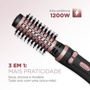 3 EM 1: Com um único produto, você seca, alisa e modela. Tudo isso de forma prática: utilize uma única mão e dê adeus ao malabarismo de usar escova em uma mão e secador na outra. A escova alisa cabelos secos, úmidos e até molhados, além de finalizar perfeitamente pontas e franjas.