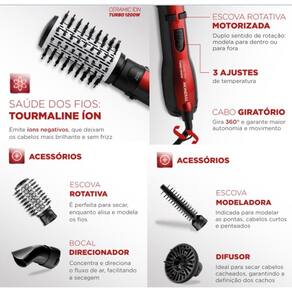 Modela, seca, alisa e define cachos em minutos, Alta potência para secar e modelar os cabelos com praticidade e rapidez. Libera íons negativos que selam as cutículas dos fios, dando mais brilho e maciez aos cabelos, eliminando o frizz e a estatística. O ajuste perfeito para todos os tipos de cabelos e resultado desejado, Difusor, Escova Modeladora, Bocal Direcionador de Ar e Capa Protetora de Cerdas.