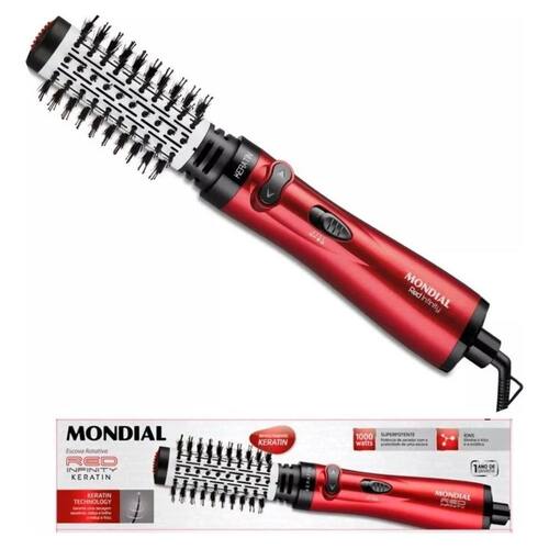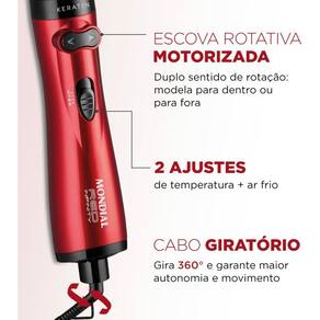 ESCOVA ROTATIVA MONDIAL RED INFINITY KERATIN ER-11-KR 110VSeca, alisa e modela: a Red Infinity Keratin é 3 em 1 e muito prática de usar! Com a escova rotativa, você produz os cabelos utilizando uma única mão. Além disso, o item possui revestimento cerâmico com queratina e protege os fios, deixando-os mais fortes, saudáveis e sem frizz. Saiba mais sobre a ER-11-KR da Mondial:ESCOVA ROTATIVA MOTORIZADA: A escova Mondial une o movimento rotativo, parecido com a escovação, com o calor do secador. E tem duplo sentido de rotação: gira 360° nos dois sentidos, permitindo modelar o cabelo para dentro ou para fora.3 EM 1: Com um único produto, você seca, alisa e modela. Tudo isso de forma prática: utilize uma única mão e dê adeus ao malabarismo de usar escova em uma mão e secador na outra. A escova alisa cabelos secos, úmidos e até molhados, além de finalizar perfeitamente pontas e franjas.SAÚDE DOS FIOS: CERÂMICA + QUERATINA: A escova rotativa Mondial possui revestimento em cerâmica com queratina e distribui o calor de maneira uniforme. Com o aquecimento, a Queratina libera partículas que garantem a proteção dos fios. O resultado: fios mais fortes, saudáveis, alinhados e sem frizz.ALTA POTÊNCIA: Os 1.000W promovem uma secagem rápida e eficiente.2 TEMPERATURAS + AR FRIO: Ajuste a intensidade de acordo com o seu tipo de cabelo e o resultado que deseja. Depois de seco e modelado, o jato frio promove melhor acabamento e reduz o frizz.CABO GIRATÓRIO 360°: Mais fácil de manusear: o fio da escova rotativa é giratório e não enrola durante o uso.FICHA TÉCNICA:- Modelo: ER-11-KR- Cor: Vermelho/Preto- Itens inclusos: 01 Escova Rotativa e Manual de Instruções- Potência: 1000W- Número de velocidades: Não se aplica- Controle de Temperatura: Sim- Cabo giratório: Sim, 360º- Níveis de temperaturas: 03 Níveis- Funções: Alisar, secar e modelar- Revestimento: Revestimento cerâmico com queratina- Peso: 0,460kg- Voltagem: 110V- Garantia: 1 anoConteúdo da Embalagem:1 ESCOVA ROTATIVA MONDIAL RED INFINITY KERATIN ER-11-KR 110V