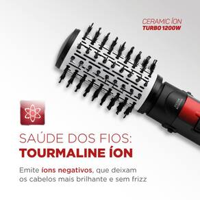 Escova Rotativa Ceramic Íon Turbo! Ela é 5 em 1: seca, alisa, modela, define cachos e finaliza franjas e pontas. Você pode produzir o visual que desejar e ainda vai ter um cabelo mais saudável, brilhante e sem frizz, graças ao revestimento cerâmico com Tourmaline Íon. A escova ainda vem acompanhada de 4 acessórios.