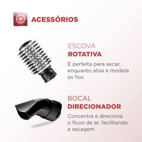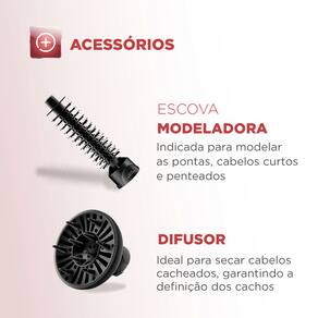 Conheça toda a praticidade que você vai conquistar com a Escova Rotativa Black Rose! Ela é 5 em 1: seca, alisa, modela, define cachos e finaliza franjas e pontas. Você pode produzir o visual que desejar e ainda vai ter um cabelo mais saudável, brilhante e sem frizz, graças ao revestimento cerâmico com Tourmaline Íon. A escova ainda vem acompanhada de 4 acessórios. ESPECIFICAÇÕES TÉCNICAS Cor Rose / Preto Dimensões do Produto 7 x 37x 7 CM Peso do produto 0,800 GR Potência Máxima 1.200 W Rotação 360° nos 2 sentidos Voltagem 127V Nível Temperatura 3 Garantia do Fabricante 1 Ano Cabo Giratório 360° Revestimento Cerâmico Função Seca, Alisa e Modela, Define Cachos Jato de Ar Frio Não RECURSOS Escova 1 x Modeladora Emissão de Íons Tourmaline GTIN 7898578153319 ITENS INCLUSOS Escova Rotativa 1 Capa Protetora 1 Bocal Difusor 1 ALIMENTAÇÃO Voltagem 127V ITENS INCLUSOS Bocal Direcionador 1