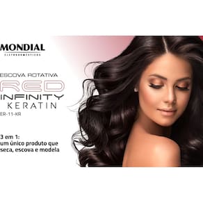 - **Nome do produto**: Escova Rotativa Red Infinity Keratin 1000W - **Marca**: MONDIAL - **Modelo**: ER-11-KR - **Potência**: 1000 watts - **Voltagem**: 110V ou 220V (escolha a voltagem correta) - **Dimensões do produto**: 7 x 37 x 7 cm - **Peso**: 470 g - **Tipo de Cabelo**: Todos os tipos de cabelo - **Cabo**: Giratório 360° - **Certificação**: BRA19/00417 - **EAN**: 7899882313284, 7898578152916
