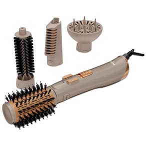 O modelo PER03 possui dupla rotação, permitindo o giro automático da escova nos dois sentidos, o que facilita na criação de diferentes estilos. Funciona por meio de energia elétrica, e seu design em cinza com detalhes em dourado combina estética com funcionalidade.