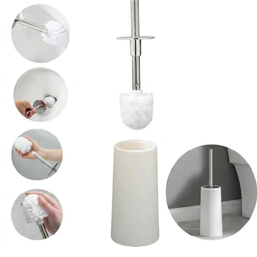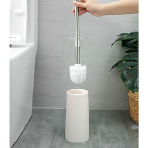 Suporte Minimalista: O recipiente branco de polímero oferece estabilidade e esconde a escova após o uso, mantendo o banheiro com aspecto sempre limpo.