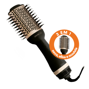 A escova secadora possui 3 temperaturas e um fluxo de ar intenso para garantir uma secagem rápida enquanto alinha os fios.