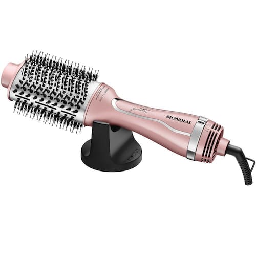 Caracteristicas: Modelo: ESJU01 Marca: Mondial Cor: Rose Funcoes: 3 em 1 seca, alisa e modela Potencia: 1300 W Niveis de temperatura: 3 Revestimento ceramico: Sim Cerdas: Duplas Cabo: Giratorio 360 com 2,5 m Voltagem: Bivolt com chave seletora Pontas: Ponta fria Emissao de ions -Turmalina-: Sim Design: Oval