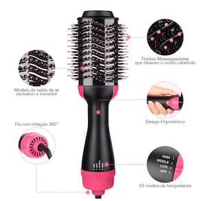 Ficha Técnica: Modelo: Escova Secadora 3 em 1 Voltagem: 110V (não bivolt) Potência: 1000W Temperatura: até 140°C Níveis de temperatura: 3 Velocidade: 3 níveis Revestimento: Cerâmico Cabo: Giratório 360° Cor: Preto com rosa Peso: Leve e portátil Uso: Doméstico Ponta fria: Sim Tipo de cerdas: Flexíveis