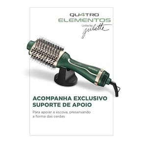 "A Escova Secadora da Linha by Juliette Qu4tro Elementos traz um revestimento especial enriquecido com infusão de Cerâmica, Titânio, Tourmaline e Nano Silver. Esses 4 elementos, juntos, protegem seus fios e garantem uma aparência mais saudável aos cabelos, com brilho intenso, maciez e sem frizz. Saiba mais sobre a Escova Secadora ES-JU-02: