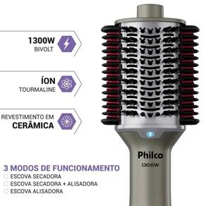 Escova Secadora Philco PES30 Bivolt. Transforme sua rotina de cuidados com os cabelos com a Escova Secadora Philco PES30 Bivolt, ideal para quem busca praticidade, eficiência e beleza todos os dias. Com design leve, ergonômico e fácil de manusear, ela seca e modela ao mesmo tempo, entregando resultado de salão na sua casa. Seja para alisar, modelar ou dar volume, a PES30 oferece um desempenho incrível com tecnologia que protege os fios e reduz o frizz. Seu sistema de emissão de íons Tourmaline cuida dos cabelos enquanto estiliza Garantindo brilho, suavidade e um visual impecável Principais Características Tecnologia Tourmaline Íon: reduz frizz e dá brilho ao cabelo 2 em 1: escova + secador em um só aparelho Resultado rápido com efeito natural e duradouro Ideal para todos os tipos de cabelo Leve, compacta e fácil de transportar Revestimento cerâmico: protege os fios contra o calor excessivo Cabo giratório 360: liberdade de movimentos Design oval: ideal para alisar e modelar com volume na raiz Bivolt automático: pode ser Utilizado em qualquer lugar Potência de 1.300W: seca rapidamente com eficiência 2 temperaturas + ar frio: ideal para finalizar o penteado usos 1 Escova Secadora Philco PES30 Bivolt 1 Manual de instruções 1 Certificado de Fabricante icações Técnicas Modelo: PES30 Marca: Philco Potência: 1.300W Voltagem: Bivolt automático 127V/220V Níveis de temperatura: 2 + ar frio Cabo elétrico: Giratório 360, com aprox. 1,8m Material do corpo: Plástico resistente com detalhes em acabamento metálico Cor: Prata com detalhes rosa Dimensões: Altura: 11,5cm Largura: 9cm Comprimento: 38cm Peso com embalagem : aproximadamente 560g Marca: Não Informado