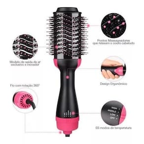 - funções: secador e alisador - características: funções de jato de ar quente - gerador de íons - cerdas flexíveis - temperatura: 3 níveis selecionáveis - velocidade: 3 níveis de velocidade. - não é com cabo giratório