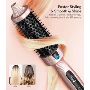 A escova térmica Terviiix de 3,8 cm é uma ferramenta versátil para criar cachos soltos e raízes volumosas, além de alcançar um estilo volumoso dos anos 90 e cabelos em camadas com volume. Esta escova de cachos aquecida possui um barril de cerâmica de turmalina que reduz a estática, doma o frizz e melhora a saúde e o brilho do cabelo. Enriquecido com óleo de argan, queratina e turmalina, libera íons negativos para minimizar os danos causados pelo calor e frizz, fornecendo calor consistente e vedação na umidade. Com um design ergonômico, incluindo uma cerdas de nylon antiqueimaduras e uma cabeça de escova redonda para distribuição uniforme de calor, esta escova é adequada para alisar, enrolar ou pentear. O visor LCD personalizável oferece configurações de temperatura de 160 °C a 204 °C, com recursos de segurança como desligamento automático de 60 minutos, cabo giratório de 360° e suporte de voltagem dupla para conveniência em viagens. Fácil de usar com cerdas que não embaraçam, esta escova é um item essencial para alcançar cabelos elegantes e saudáveis - Resultados profissionais: crie raízes volumosas, cachos soltos e um estilo volumoso dos anos 90 com o pincel de cachos aquecido Terviiix de 3,8 cm. Seu barril de cerâmica de turmalina reduz a estática, doma o frizz e melhora a saúde e o brilho do seu cabelo, além de fornecer versatilidade para alcançar cabelos em camadas com volume. (não é um secador de cabelo) - Redução de danos e frizz: enriquecido com óleo de argan, queratina e turmalina, este pincel libera íons negativos para minimizar os danos causados pelo calor e frizz, fornecendo calor consistente ao cabelo e selando a umidade para cabelos elegantes e saudáveis. - Design ergonômico: um design de cabeça de escova redonda com um barril revestido de cerâmica de turmalina garante uma distribuição uniforme de calor, enquanto a alça ergonômica e as cerdas de nylon anti-queimaduras facilitam a obtenção de cachos naturais. Pode ser utilizado para alisar, enrolar ou simplesmente como um pente comum. - Fácil de usar: o pente frio e os dentes largos e as cerdas que não embaraçam facilitam a aderência e a passagem suave pelo cabelo, evitando emaranhados e oferecendo maior conveniência ao modelar seu cabelo. - Configurações personalizáveis: o visor digital LCD oferece uma variedade de configurações de temperatura de 160 °C a 204 °C para atender a vários tipos de cabelo. Inclui um recurso de desligamento automático de 60 minutos para segurança, um cabo giratório de 360° para facilidade de uso e suporte de tensão dupla (100-240V) para conveniência de viagem.